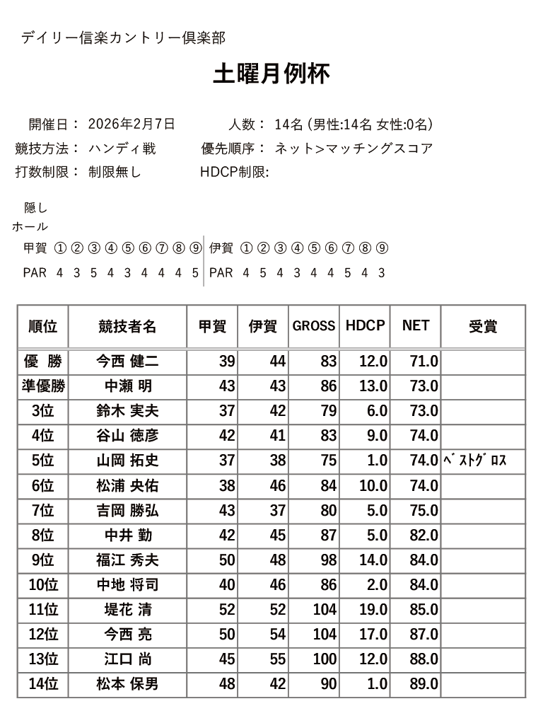 2026年2月に開催されました、土曜月例杯、平日月例杯、月例杯Aクラス、月例杯Bクラスの競技結果を掲載しました。